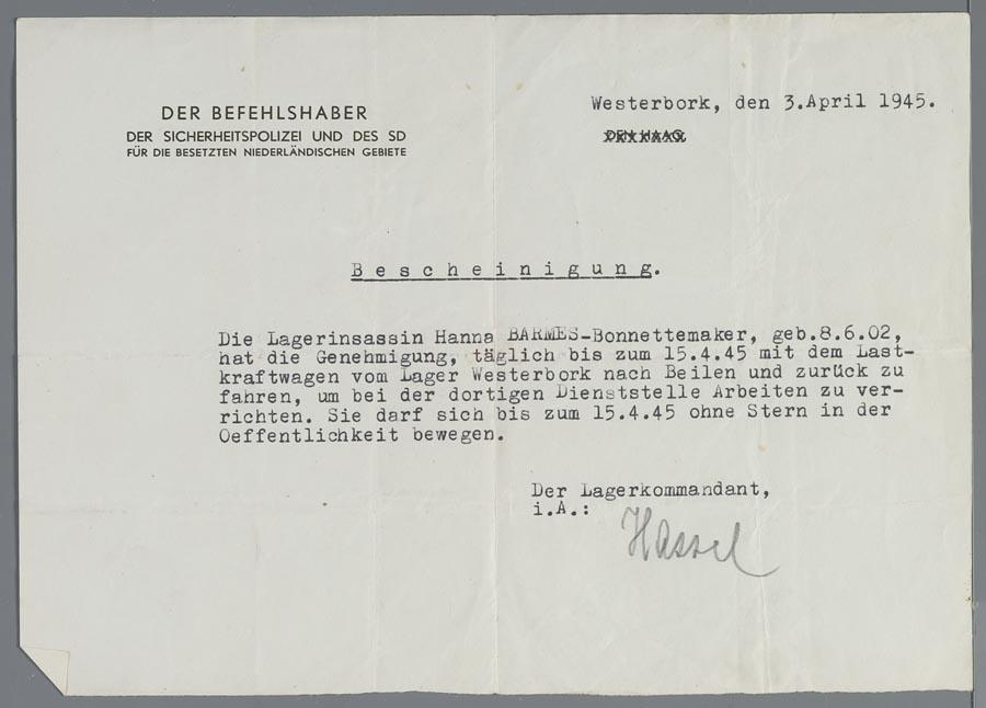 Verklaring dat Hanna Barmes-Bonnettemaker zonder ster naar Beilen mag reizen om daar arbeid te verrichten, 3 april 1945
