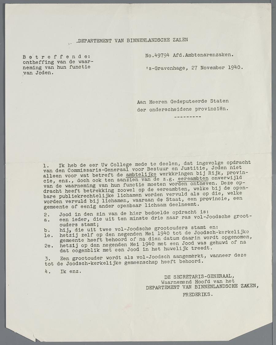 Bief van het Departement van Binnenlandse Zaken met de mededeling dat joden niet alleen uit hun ambtelijke functies moeten worden ontslagen, maar ook van hun ere-functies moeten worden ontheven, november 1940