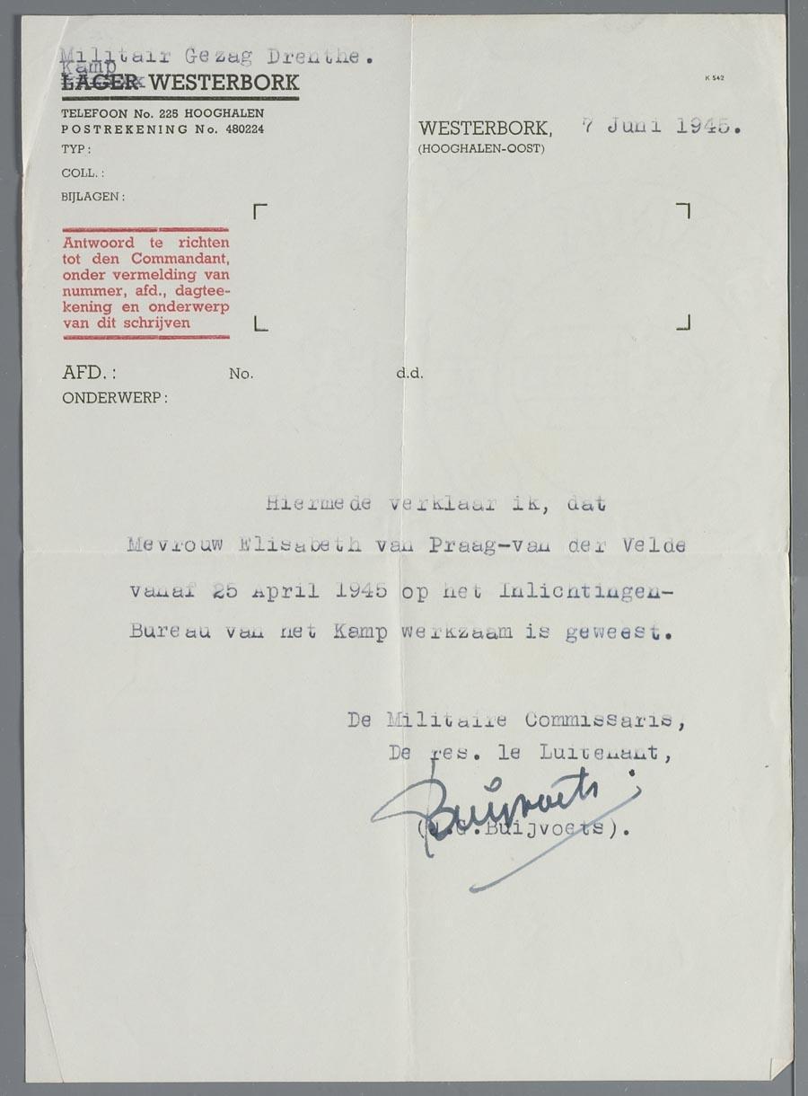 Verklaring van het Militair gezag Drenthe (Kamp Westerbork) dat mw. E.R. van Praag vanaf 25 april 1945 werkzaam is geweest op het inlichtenbureau van Kamp Westerbork, juni 1945