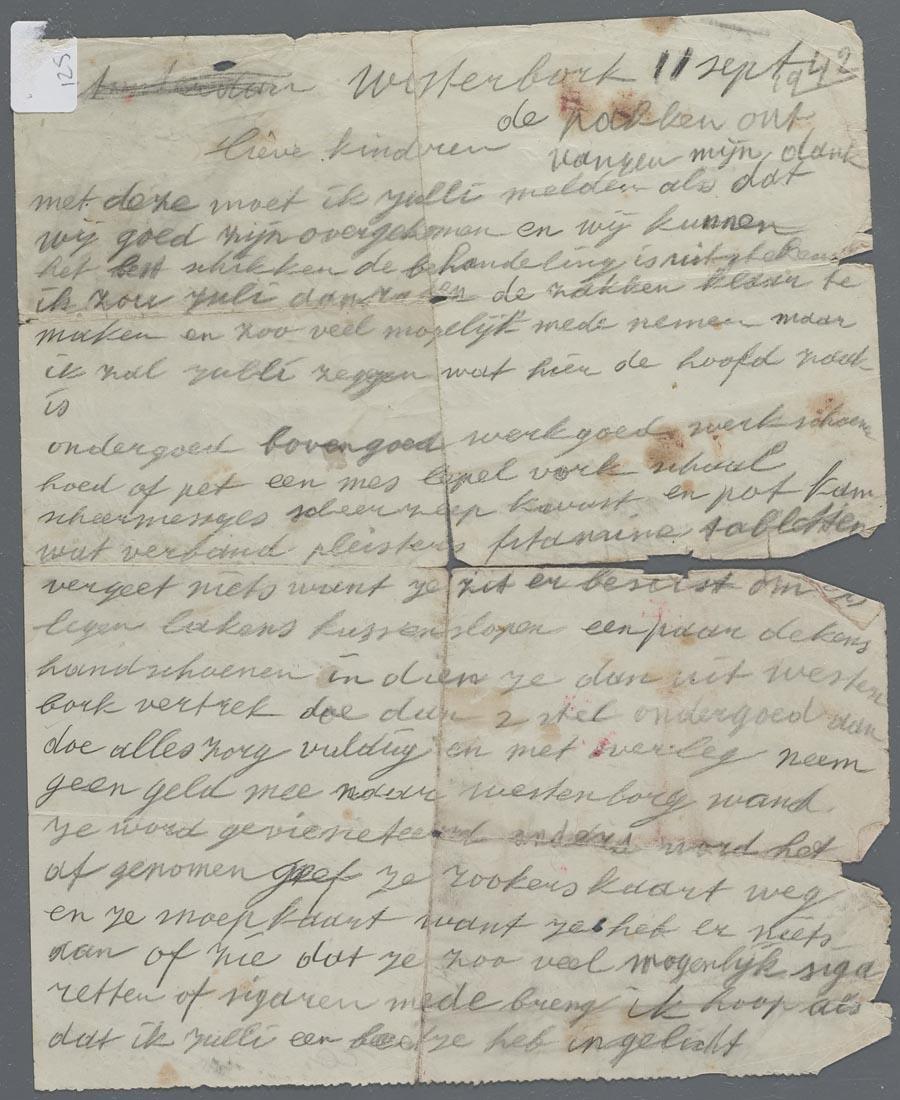 Afscheidsbrief, uit de trein gegooid, van Marcus en Elisabeth Wagenhuizen aan hun kinderen, september 1942