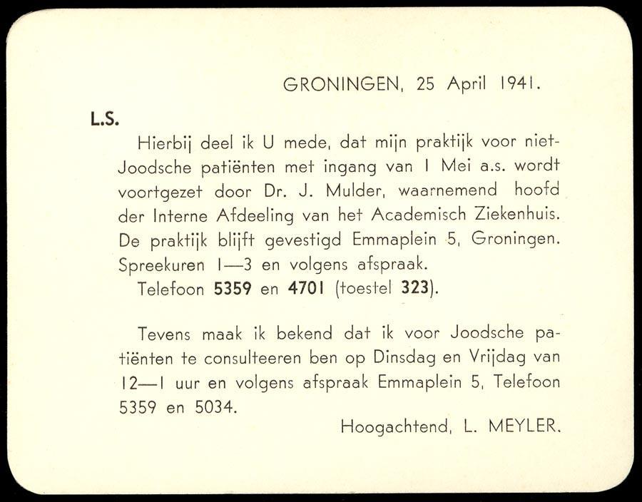 Mededeling v. Dr. L. Meyler dat de behandeling van niet-joodse patienten wordt overgenomen, en dat hij joodse patienten blijft behandelen, april 1941