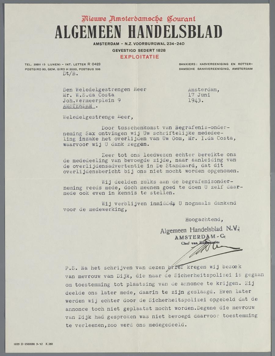 Brief aan mr. W.S. da Costa betreffende weigering van plaatsen van overlijdensbericht in Algemeen Handelsblad, 1943