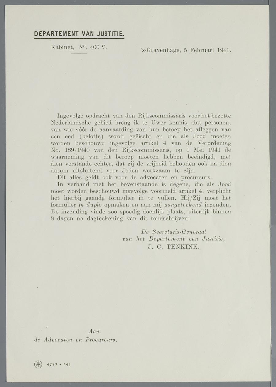 Aanmeldingsformulier n.a.v. verordening 189/1940 + tekst van de verordening + begeleidend schrijven dep. v. Justitie, 1941