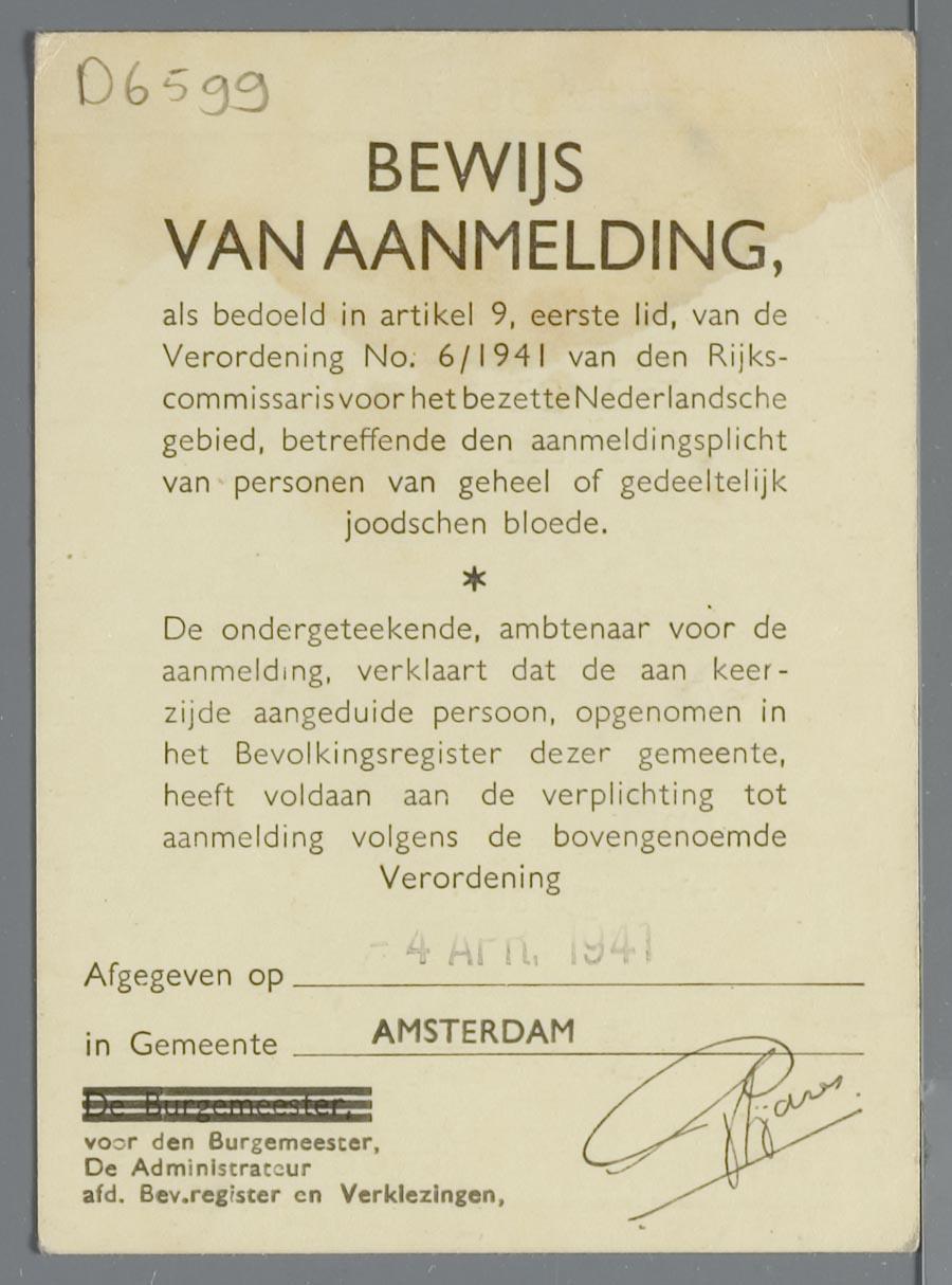 Aanmeldingsbewijs voor personen van geheel of gedeeltelijk joodschen bloede t.n.v. Henny Koe, 1941