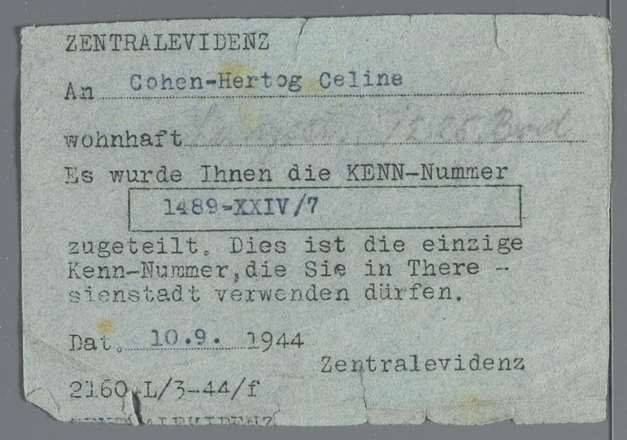 Mededeling over de toekenning Kenn-nummer in Theresienstadt aan Celine Cohen-Hertog, 1944