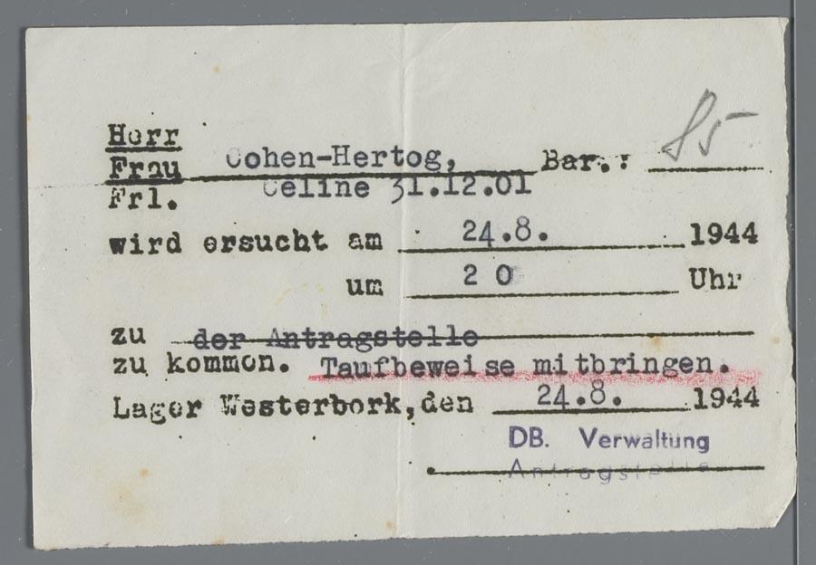 Mededeling voor Celine Cohen-Hertog om zich te melden en haar doopbewijs mee te nemen, 24 augustus 1944