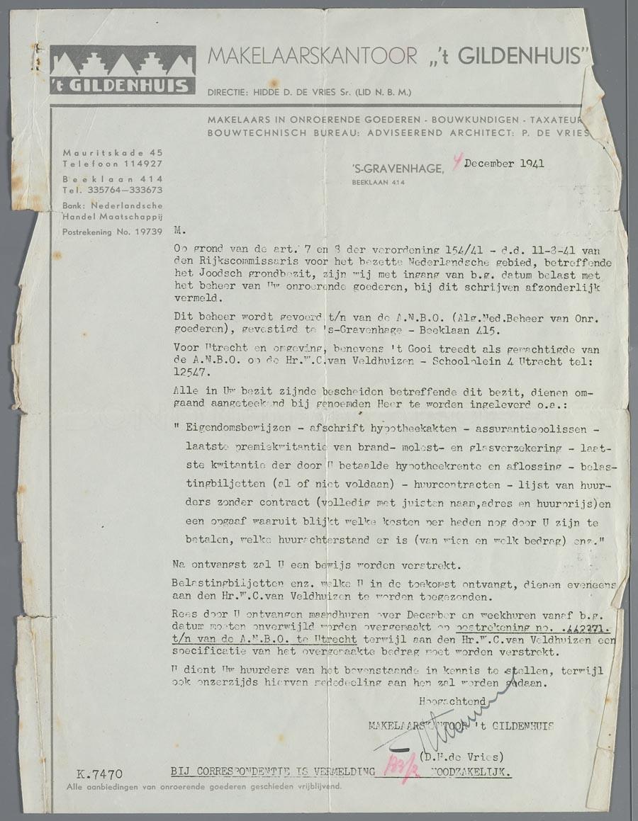 Brief van makelaarskantoor Gildenhuis (Verwalter) met de oproep eigendomsbewijzen, hypoteken en andere papieren betreffend onroerend goed en grondbezit in te leveren, 1941