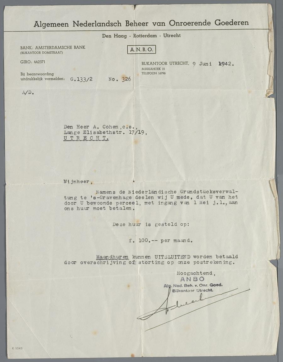Brief van het Algemene Nederlands Beheer van Onroerende Goedeen aan dhr. A. Cohen, Lange Elizabethstraat 17/19 in Utrecht, dat hij huur aan hen moet gaan betalen, juni 1942