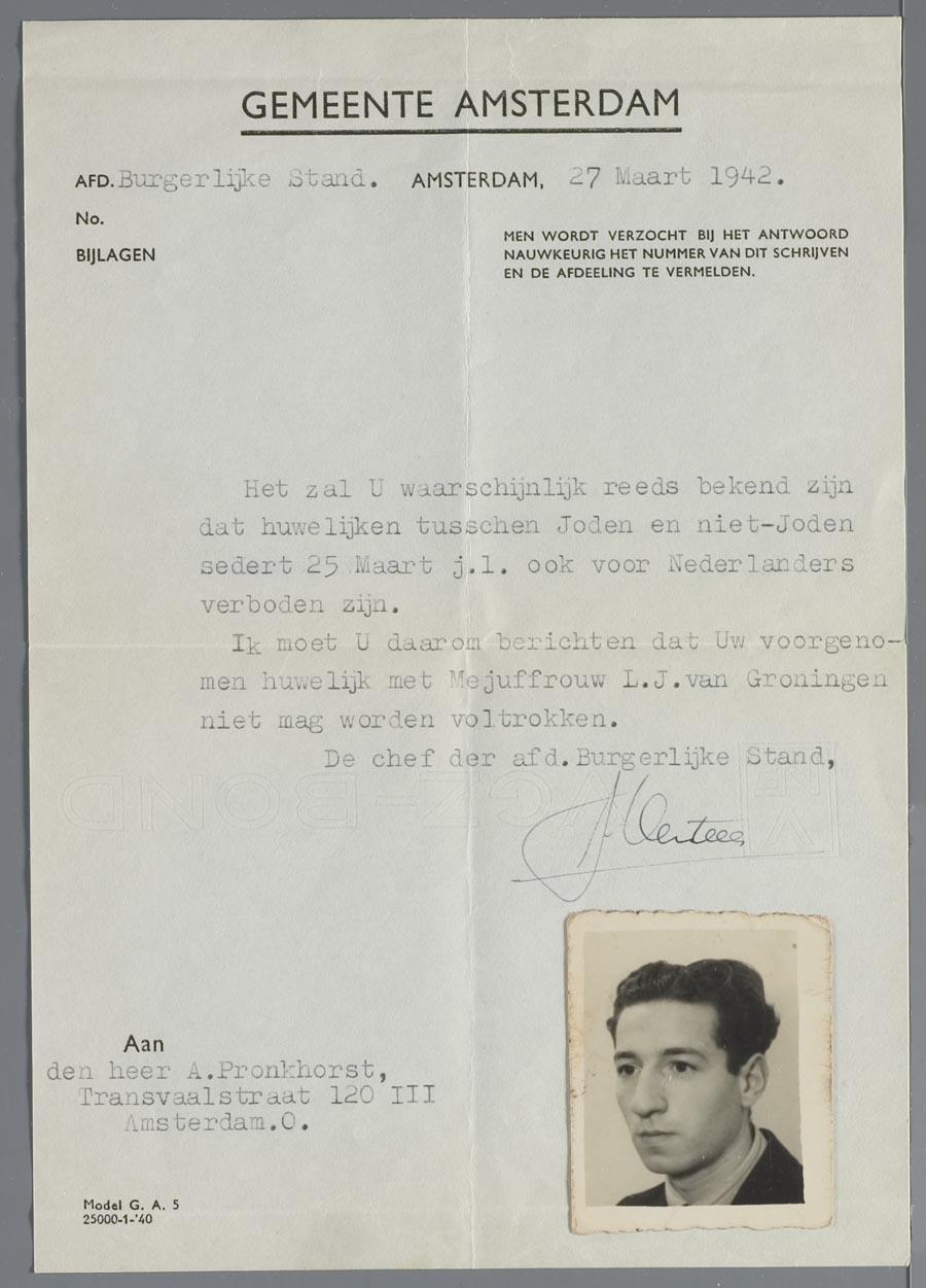 Brief van de Burgerlijke Stand over het verbod op het huwelijk tussen de joodse Ab Pronkhorst en de niet-joodse Loes van Groningen, maart 1942
