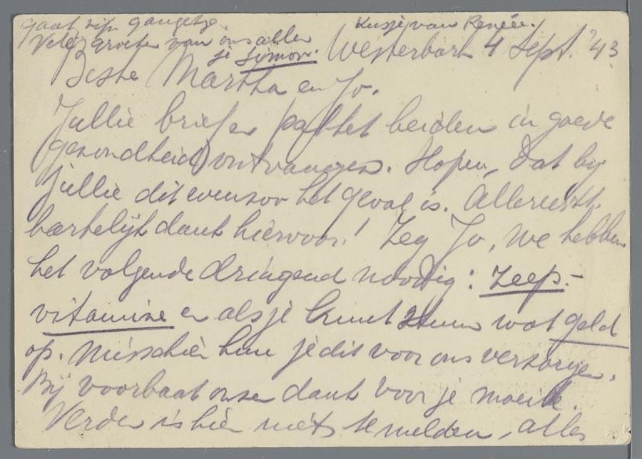 Briefkaart van Simson Vieijra aan Jo en Martha Swaap, over het toesturen van een pakket, Westerbork, september 1943
