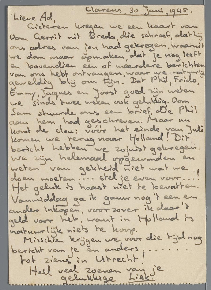 Briefkaarten (7) van fam. Muller aan Adry van Beek vanuit een vluchtelingenkamp in Zwitserland, juli 1945
