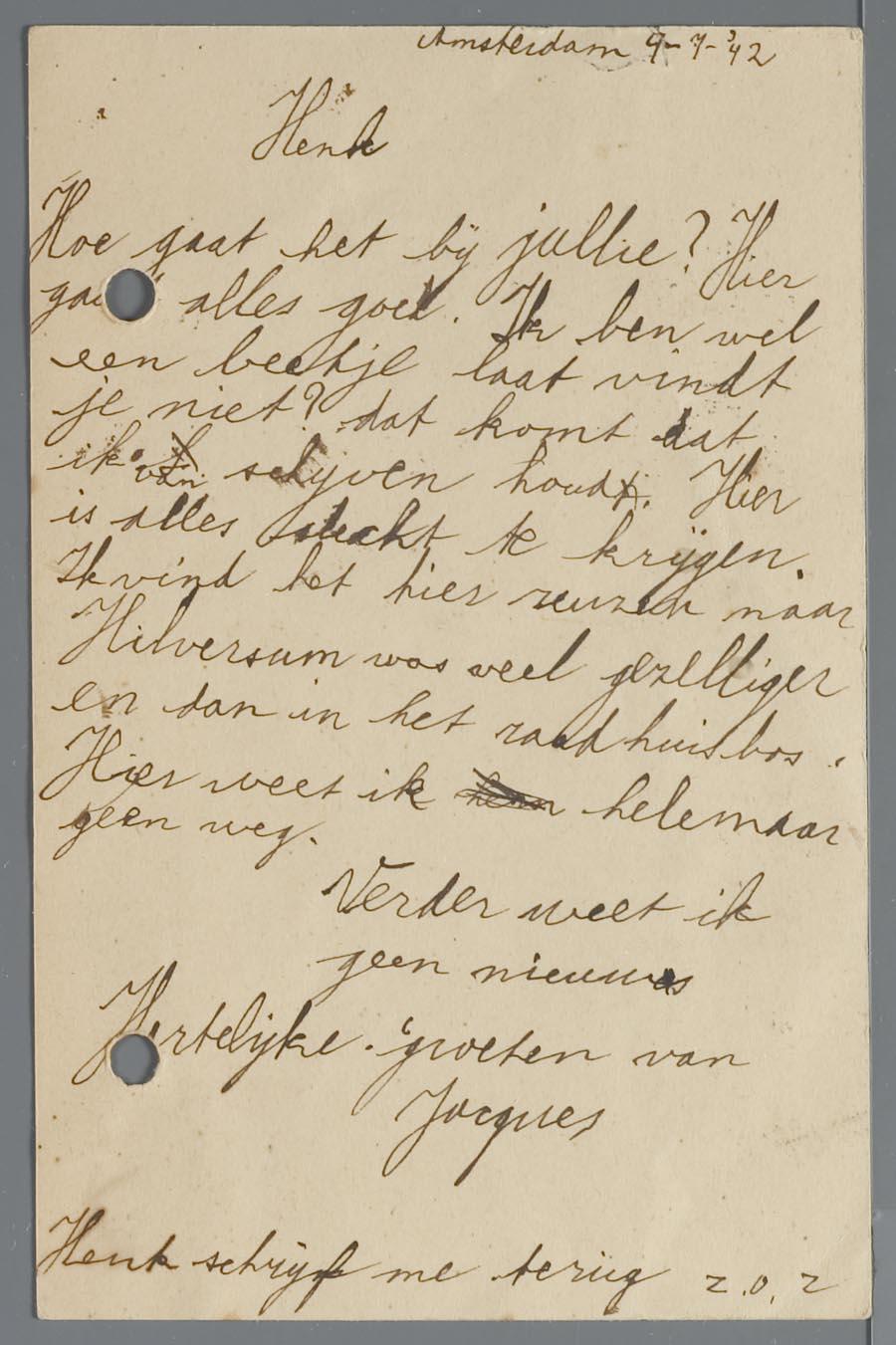 Briefkaart van Jacques Schijveschuurder aan zijn vriendje Henk van de Wal, 1942