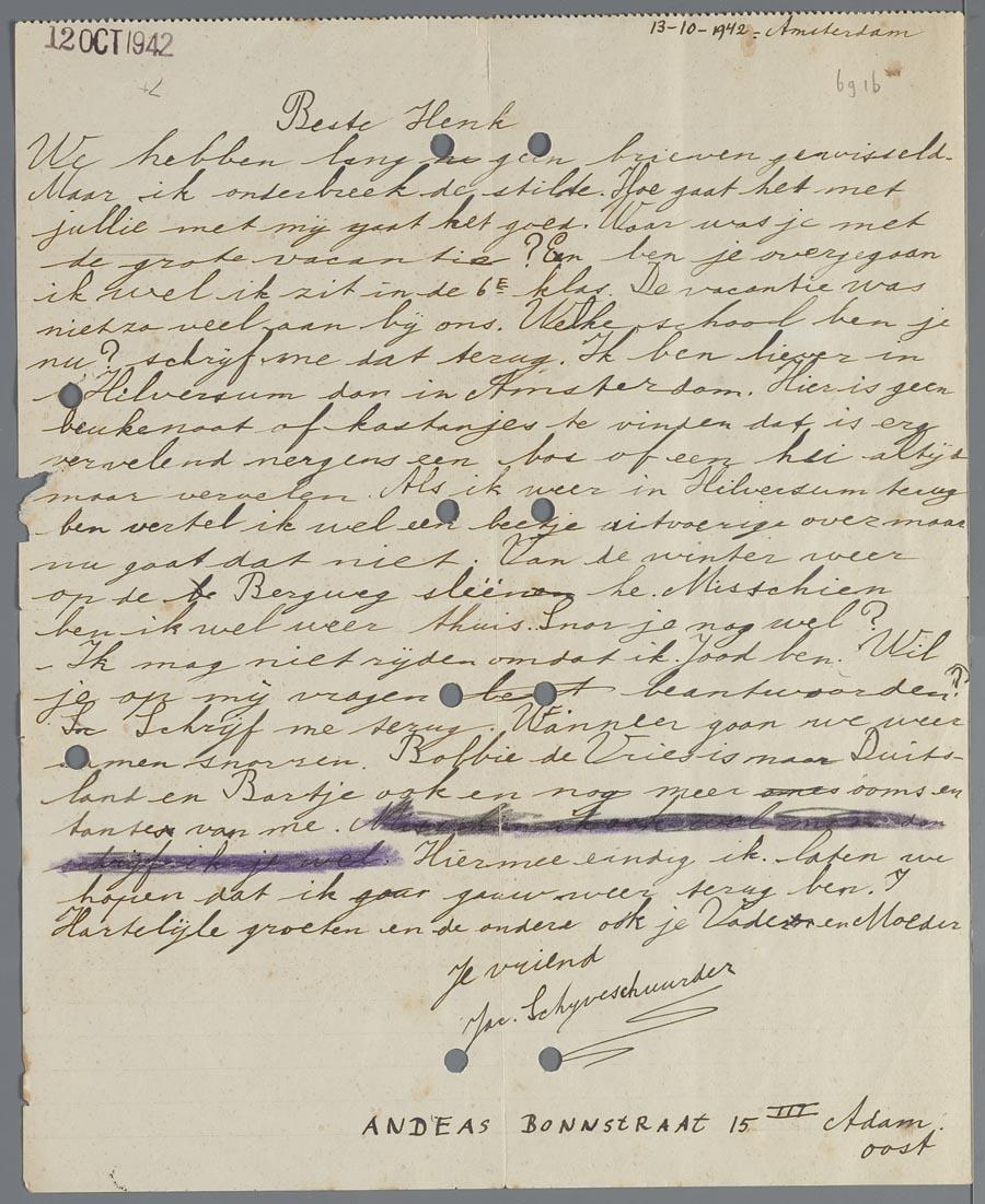 Het gezin waar Jacques Schijveschuurder deel van uitmaakte verhuisde al voor de zomer van 1942 verplicht van Hilversum naar Amsterdam. Jacques klaagt in deze brief aan zijn vriendje Henk van der Wal over het feit dat hij in Amsterdam woont. Hij mist de bossen en de hei in het Gooi, waar hij eigenlijk vandaan komt. Hij maakt ook expliciet melding van anti-joodse maatregelen: "Snor je nog wel? Ik mag niet rijden omdat ik Jood ben."