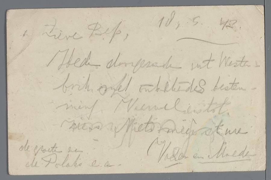 tekst: "18.5.43. Lieve Bep, Heden doorgezonden uit Westerbork met onbekende bestemming. Vaarwel en tot ziens. Niets meer sturen, Vader en Moeder. De groeten aan de Polaks e.a."