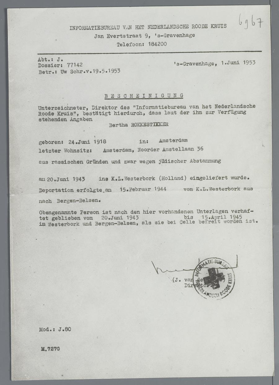 Kopie van verklaring van het Ned. Rode Kruis m.b.t. deportatie Bertha Rokkestikker, 1953
