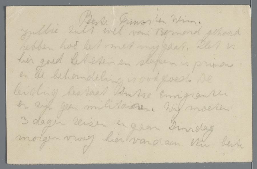 Briefkaart van Fia Broekman uit Westerbork aan Truus Sant en haar man Wim Tokkie, 1942