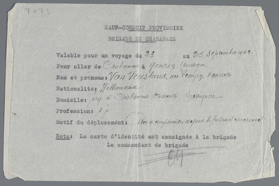 Reisvergunning t.n.v. Henriette van Vriesland-Leeuwin, september 1942