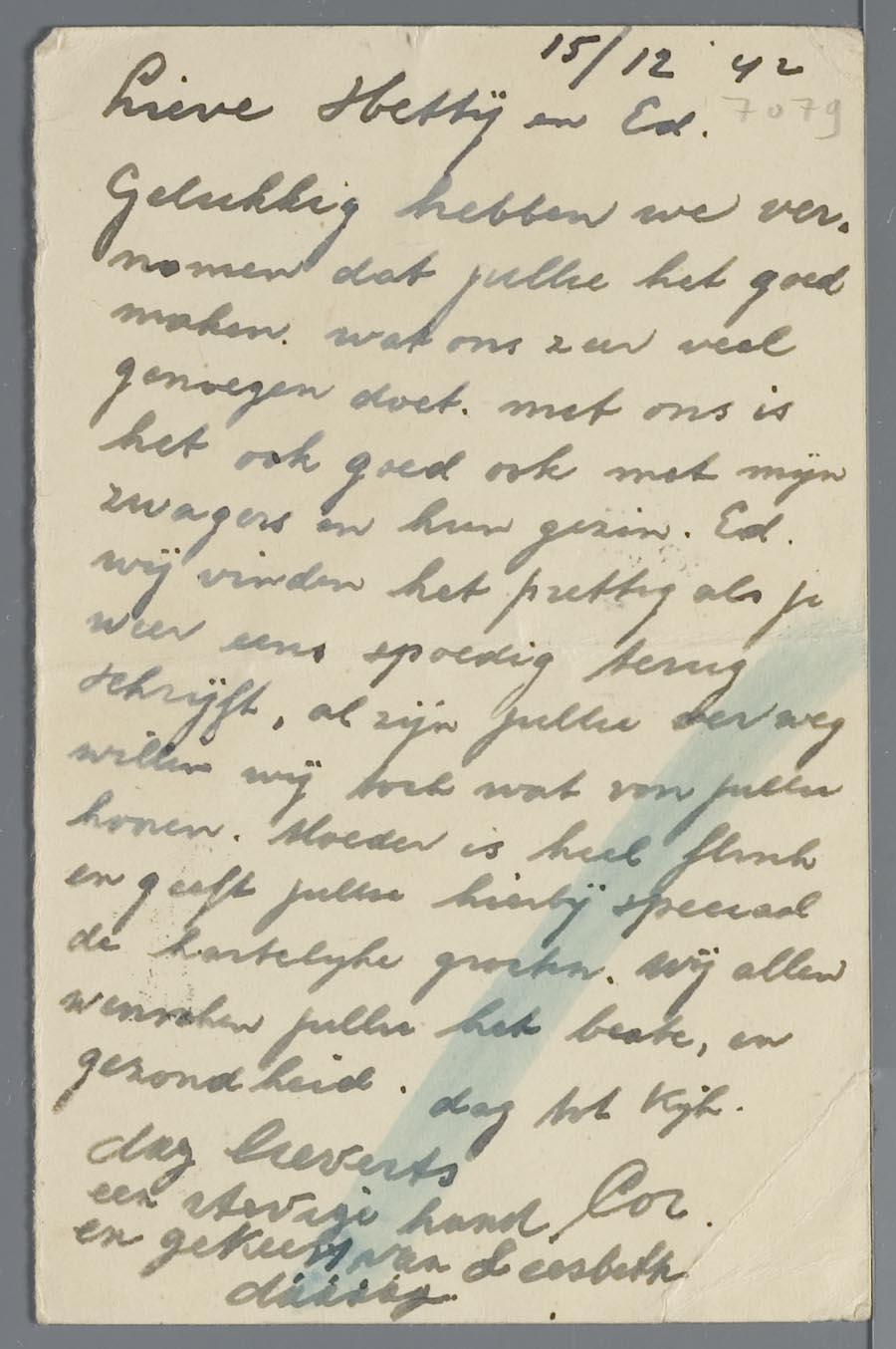 Briefkaart van Cor van Schooneveld in Amsterdam aan Hetty en Eduard van Vriesland tijdens hun ballingschap in Zwitserland, 1942