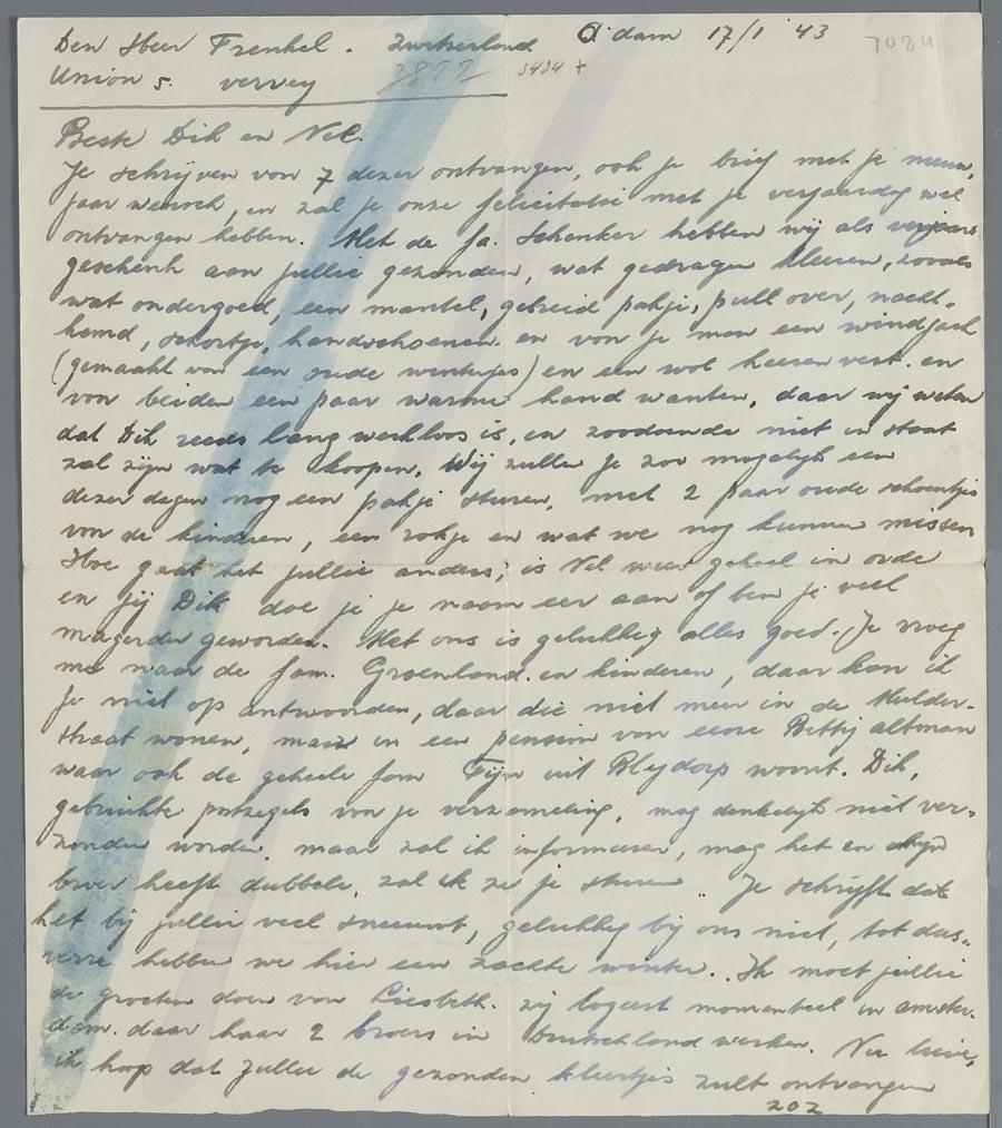 Brief aan Hetty en Eduard van Vriesland tijdens hun ballingschap in Zwitserland, januari 1943