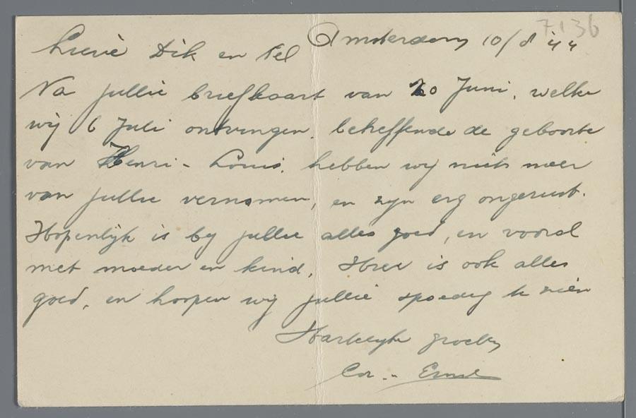 Briefkaart van Cor van Schooneveld in Amsterdam aan Hetty en Eduard van Vriesland tijdens hun ballingschap in Zwitserland, n.a.v. de geboorte van hun zoon, augustus 1944
