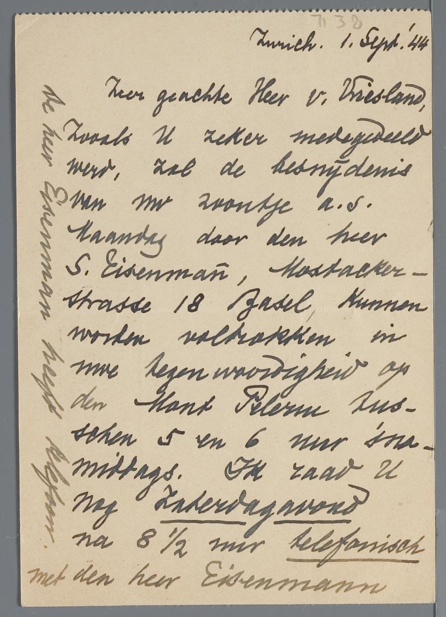Briefkaart aan de heer E.J. van Vriesland over de besnijdenis van zijn zoon, die in Basel zal plaatsvinden, 1944