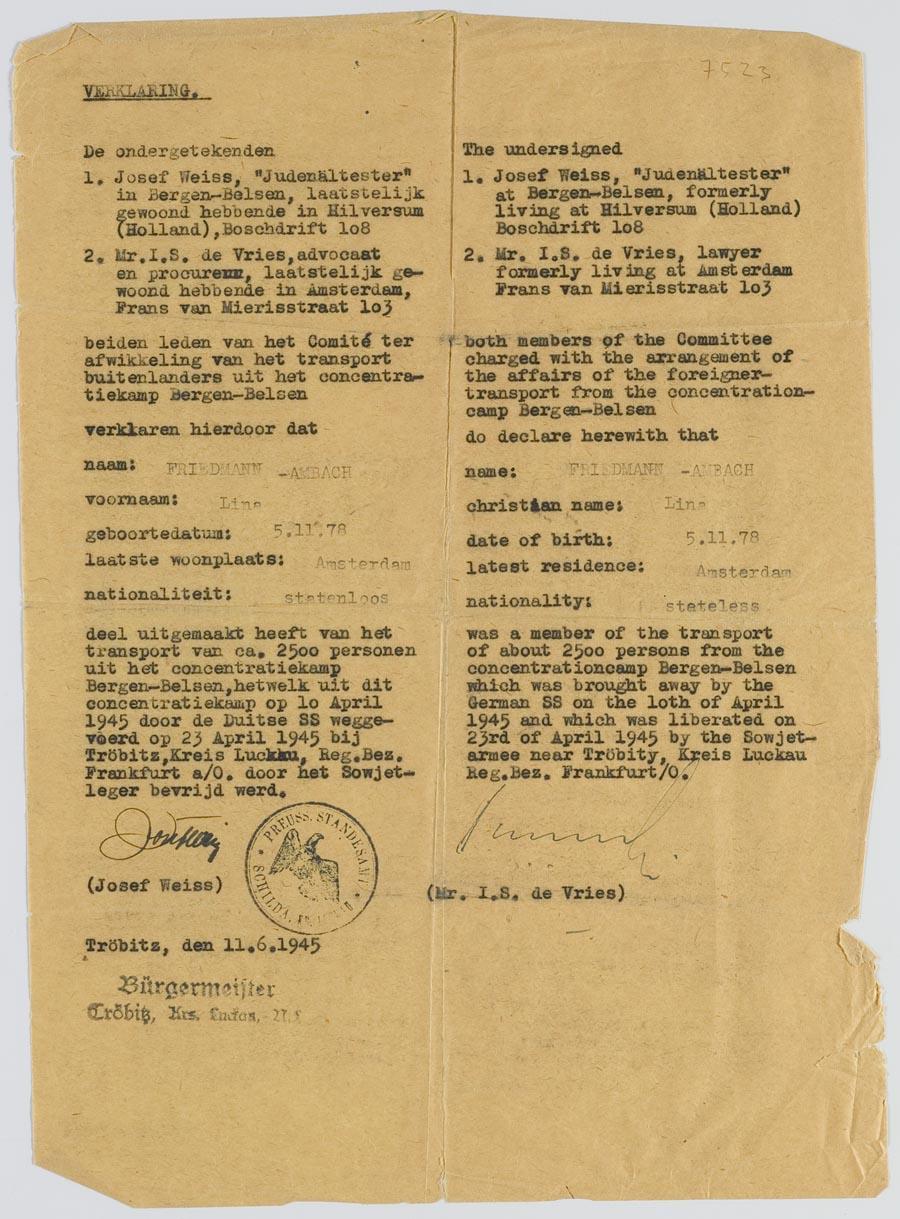 Verklaring van Josef Weiss en I.S. de Vries, lid van het Comité ter afwikkeling van het transport buitenlanders uit het concentratiekamp Bergen-Belsen, d.d. 11 juni 1945. Het betrof de voormalig gevangene Lina Friedman-Ambach.