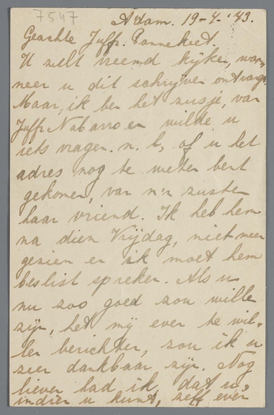 Briefkaart van Elsje Nunes Nabarro aan Mej. Pannekeet, 1943