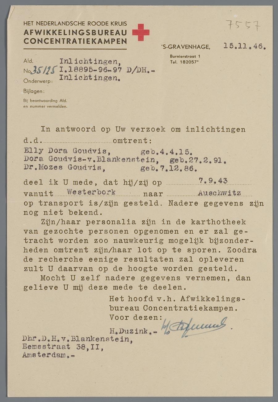 Brief van het Ned. Rode Kruis aan D.H. van Blankenstein over deportatie van de familie Goudvis naar Auschwitz, november 1946