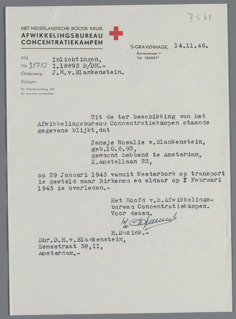 Brief van het Ned. Rode Kruis aan D.H. van Blankenstein met overlijdensbericht van Jansje Rosalie van Blankenstein, 1946