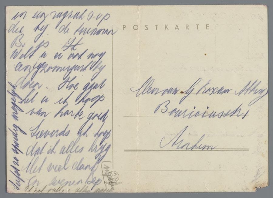 Briefkaart van Bep Sternfeld aan mevrouw Truus Roscam Abbing in Arnhem, geschreven tijdens deportatie naar Westerbork, 2 juni 1944