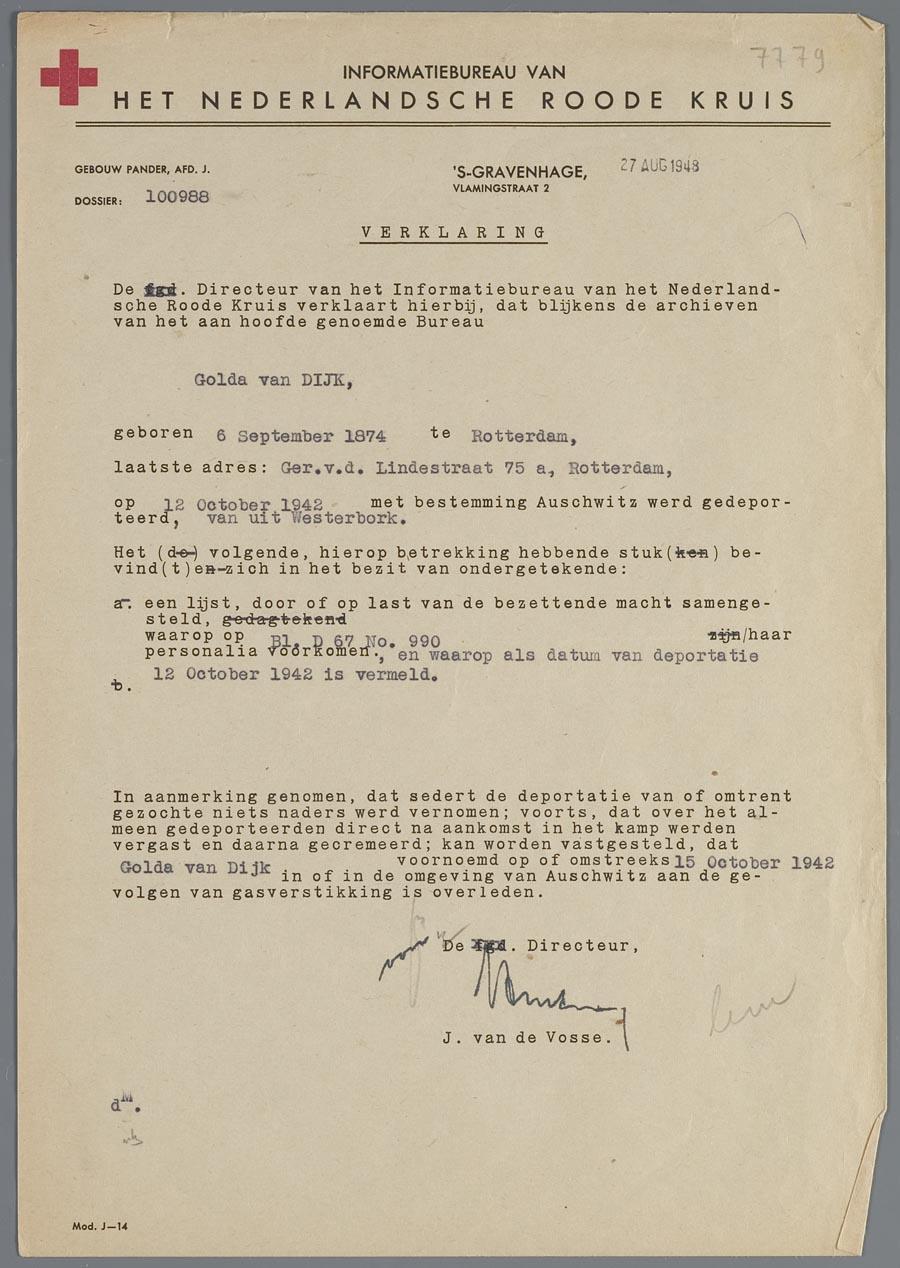 Verklaring van het Ned. Rode Kruis m.b.t. het overlijden van Golda van Dijk, 1948