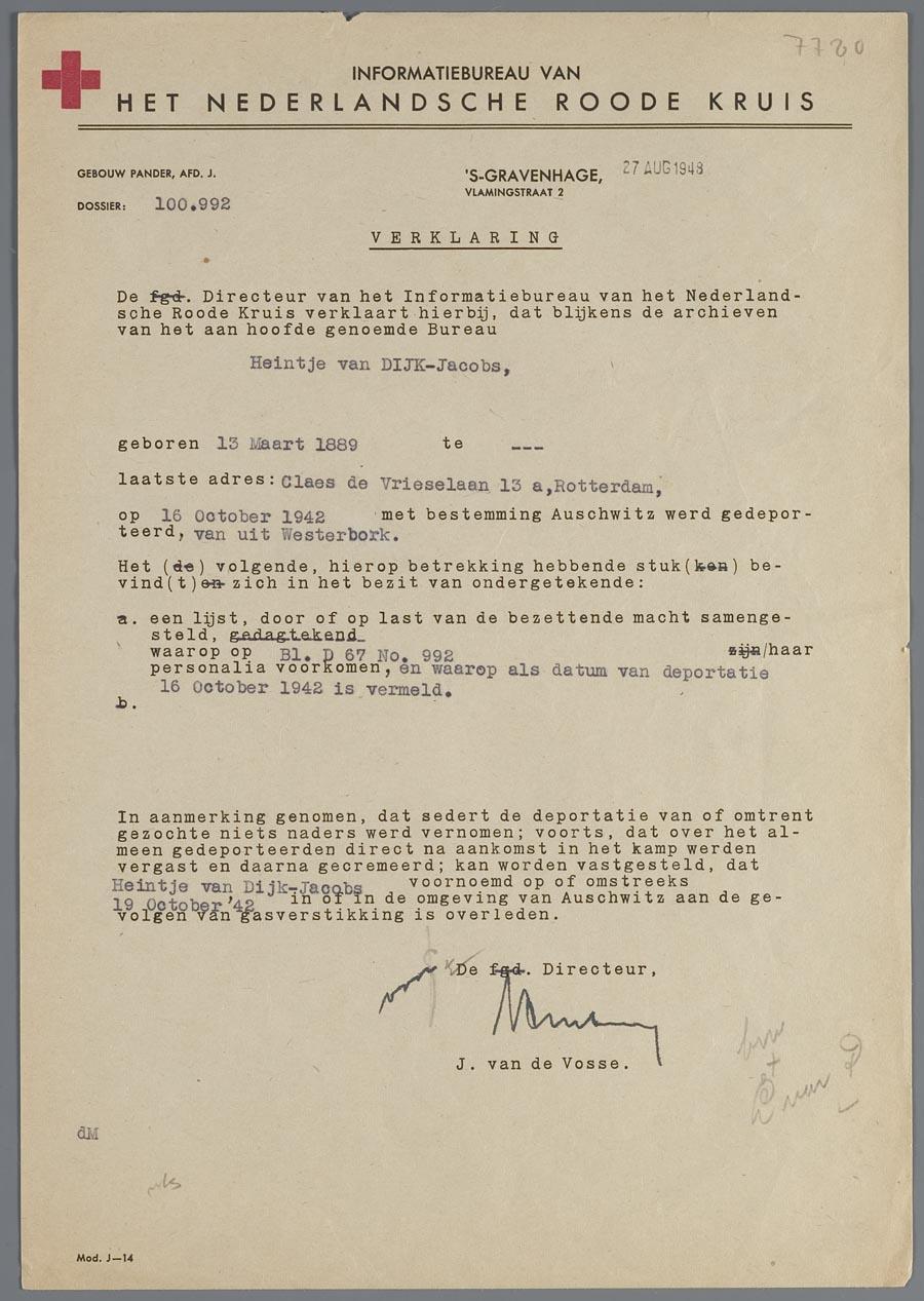 Verklaring van het Ned. Rode Kruis m.b.t. het overlijden van Heintje van Dijk-Jacobs, 1948