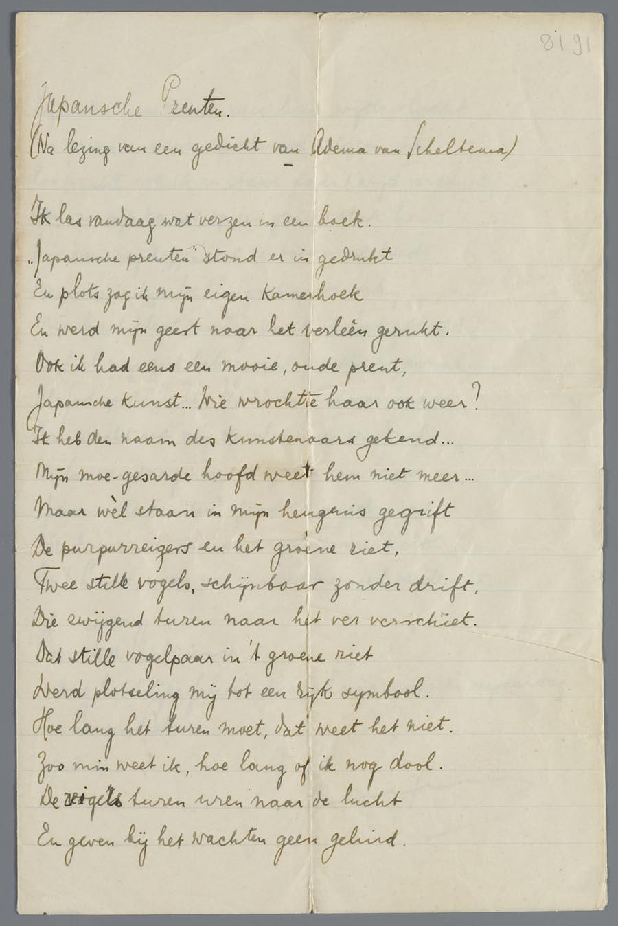 Handgeschreven gedicht "Japansche prenten" geschreven door Joseph Gompers in Bergen-Belsen en opgedragen aan Ted Andriesse t.g.v. haar verjaardag, 1944