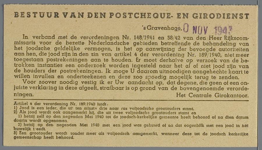 Drukwerk van de Postcheque- en Girodienst met anti-joodse maatregelen, 30 november 1943