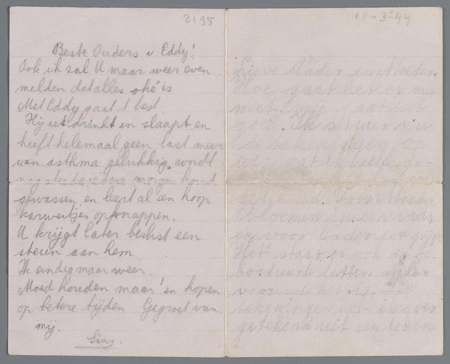 Brief van Ed. van Thijn aan zijn ouders vanuit de onderduik met aan achterzijde een paar woorden van de onderduikmoeder, 1944