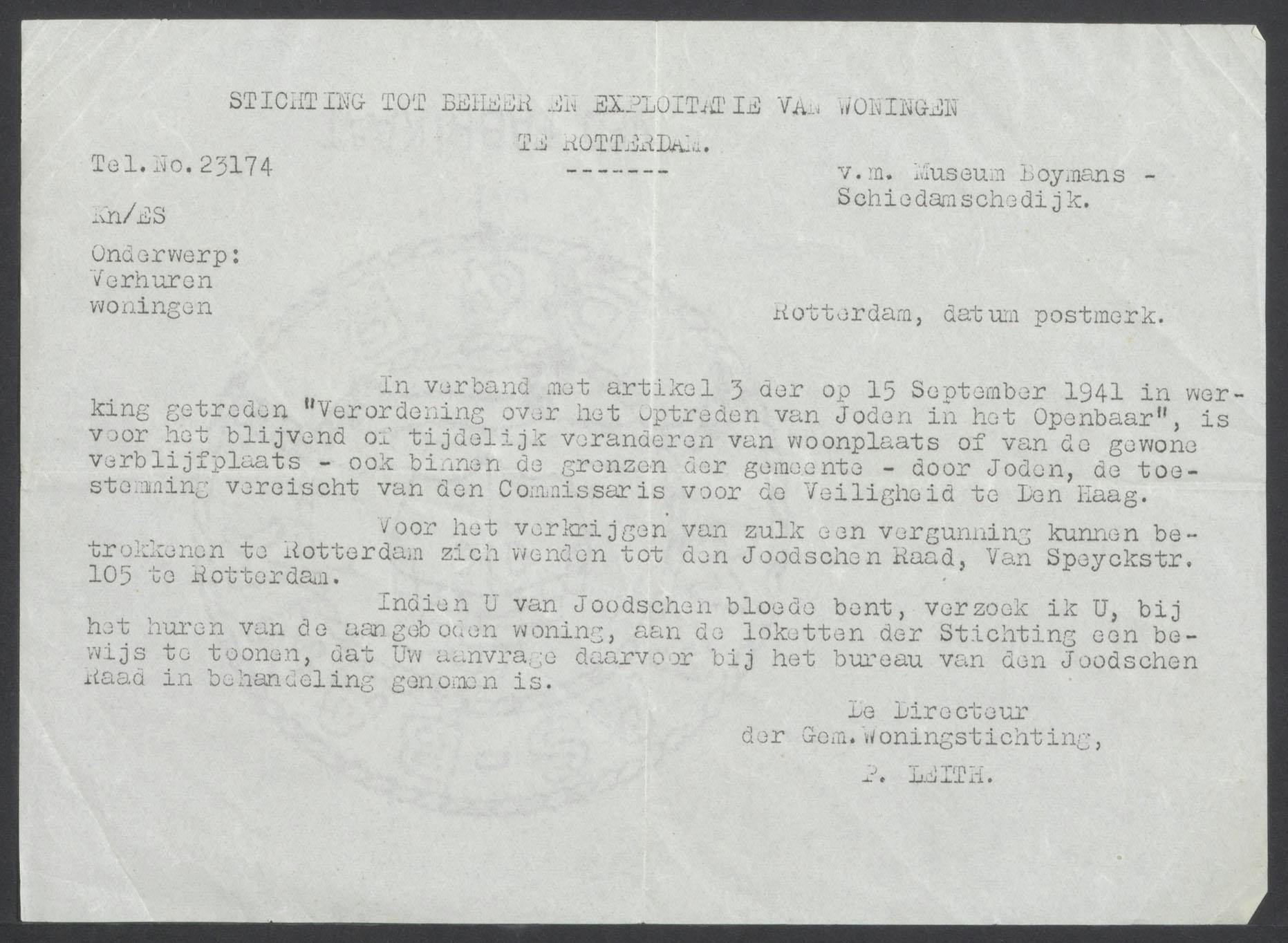 Bericht van de Gemeentelijke Woningstichting aan het voormalig Museum Boymans over het aanvragen van een verhuisvergunning, circa 1941.