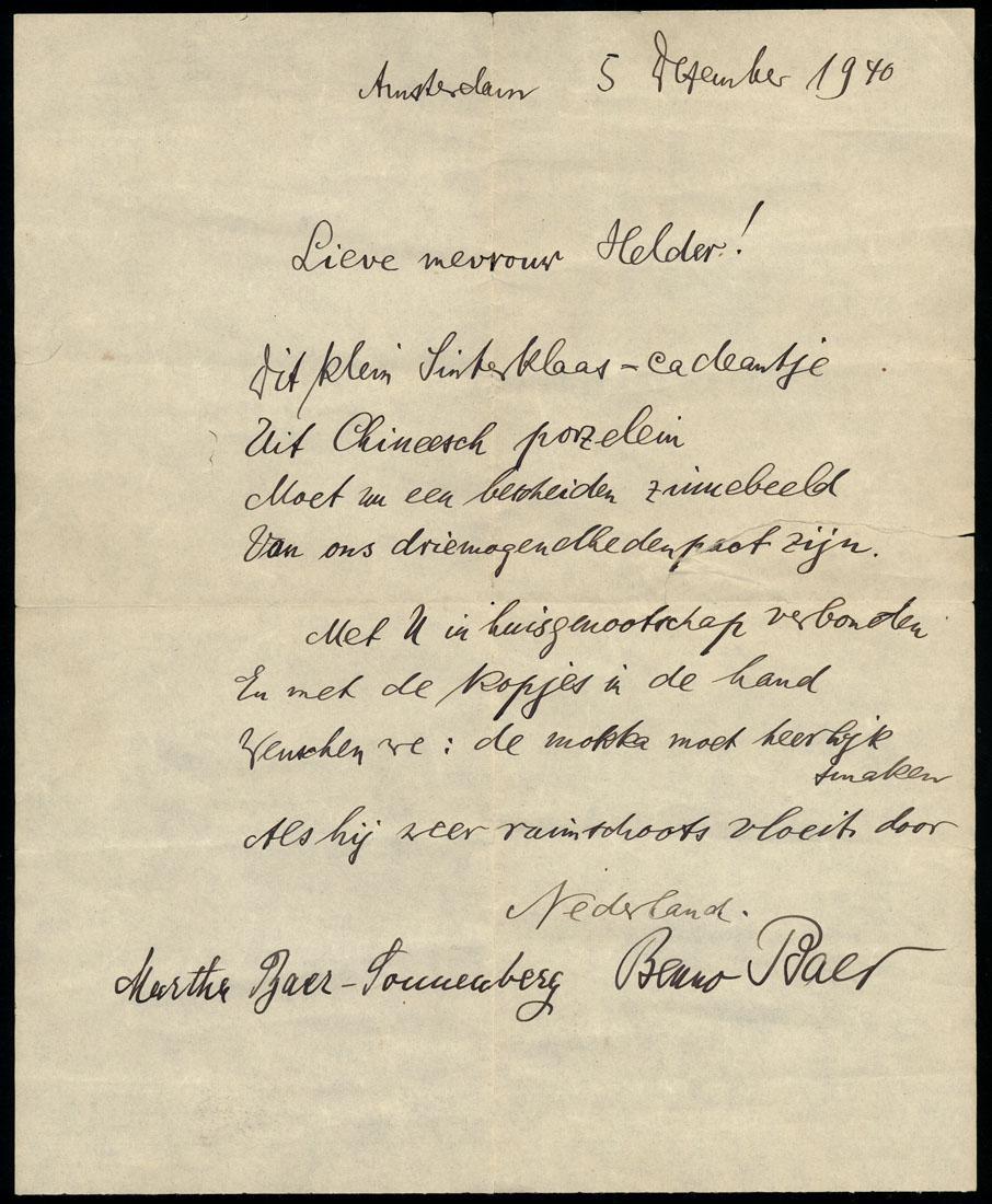 Bevat: een brief van een met het echtpaar bevriende vrouw uit Berlijn, waarin gesproken wordt over pogingen om Duitsland te verlaten (Berlijn, 1939); visitekaartjes van B. Baer; inventarislijst van de bibliotheek van B.Baer, die te koop werd aangeboden; voedsel- en kledingbonnen; Sinterklaas-briefje van het echtpaar Baer aan mevr. Helder bij wie zij ondergedoken waren (Amsterdam 1940).