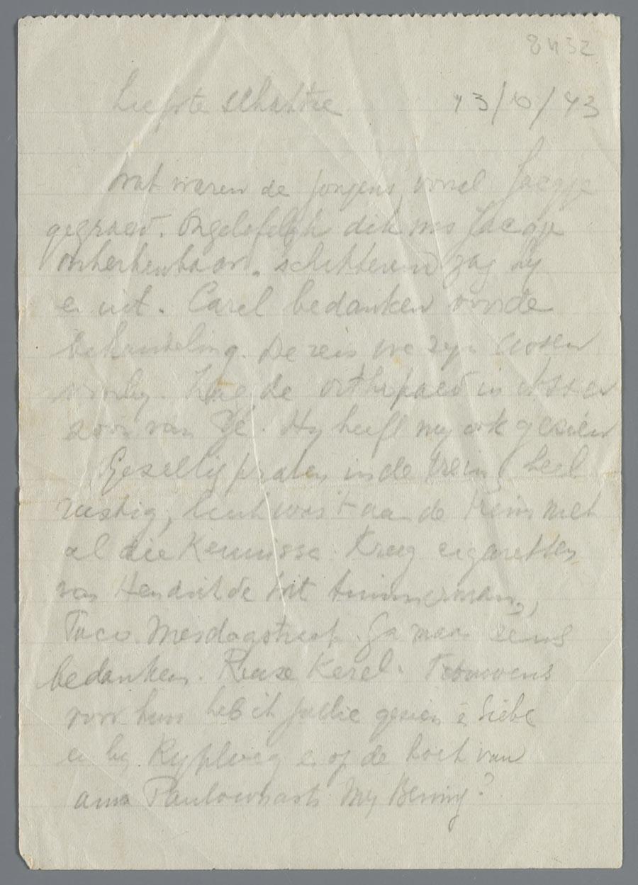 Brief van Max Jacques Roeper geschreven in de trein van Groningen naar Vught aan zijn vrouw Louise Roeper-Piekema, oktober 1943.