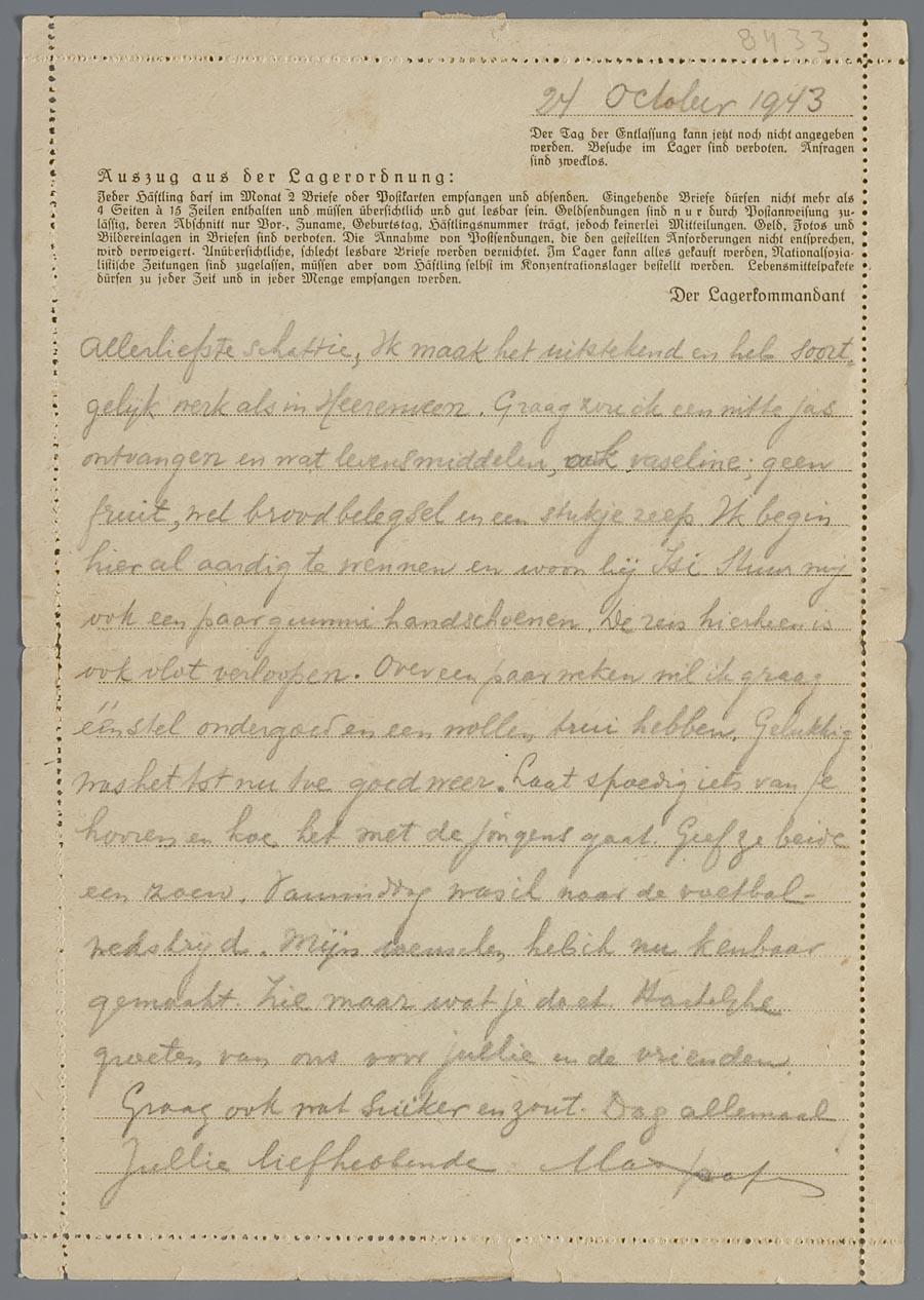 Brief van Max Jacques Roeper uit kamp Vught aan zijn vrouw Louise Roeper-Piekema, d.d. 24 oktober 1943