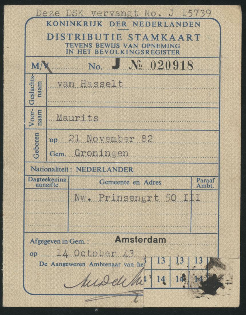 Oorlogsdocumenten (14) van Maurits van Hasselt (gehuwd met Elisabeth Numan) en hun dochter Leonora Hermanna van Hasselt, 1939-1943