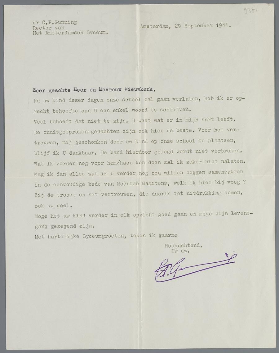 Brief van C.P. Gunning, rector van het Amsterdams Lyceum, aan de ouders van de joodse leerling Nieuwkerk, die de school heeft moeten verlaten, september 1941