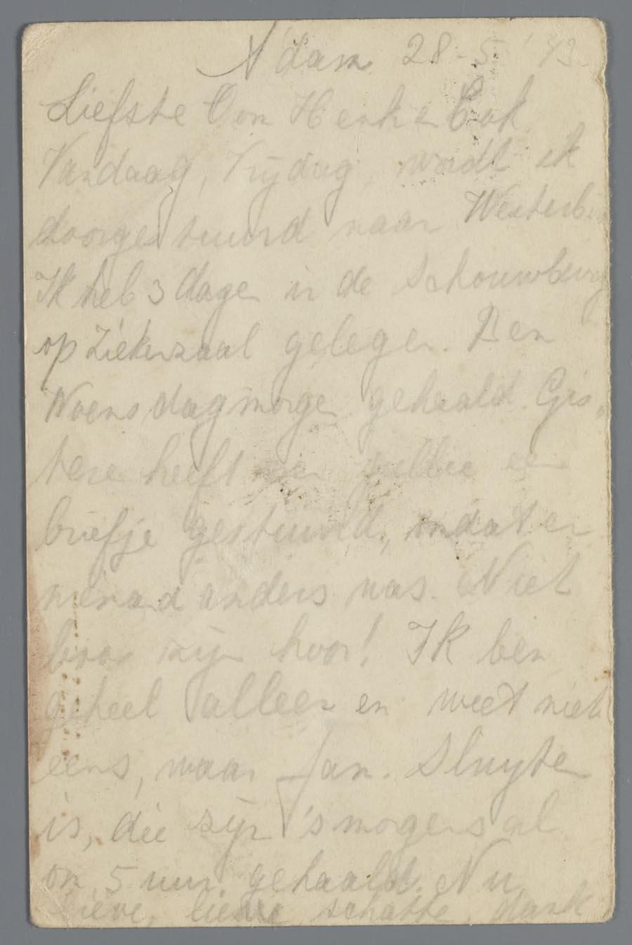 Briefkaart uit de Hollandsche Schouwburg in Amsterdam van Elsje (Esther) Nunes Nabarro aan de familie Henk Lavell, d.d. 28 mei 1943. In de brief noemt ze de familie Sluijter. Het gaat waarschijnlijk om Louis Sluijter en Margaretha Sluijter-Sacksioni.