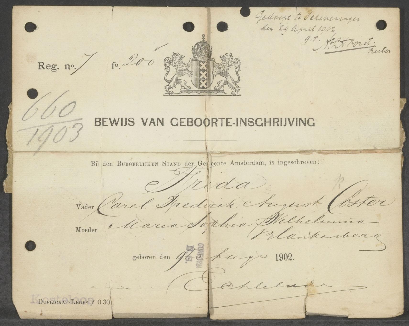 Bevat: a) geboortebewijs Frida Coster, dd. 1902. b) doopbewijs van Parochiekerk Amsterdam, m.b.t. FC, d.d. 1918, m.b.t. doop in 1906. c) nationaliteitsbewijs van Frida Coster met pasfoto, Amsterdam 1931. d) persoonsbewijs FC, april 1944. e) ingevuld formulier met verzoek aan kantonrechter Amsterdam om toestemming te geven voor huwelijk Frida Coster en salomon de Zwarte, wegens weigering van de vader van FC om toestemming te geven, maart 1932 f) geboortecertificaten van beide ouders van Frida Coster, bremen juni 1943. g) huwelijkcertificaat ouders FC, Bremen, juni 1943 h) overlijdenscertificaten van 4 vooruders van FC, Bremen, 27 juli 1943 i) 2 uittreksels uit doopregister van ouders FC (beide 2 exemplaren), Bremen, september 1943. j) uittreksels uit huwelijksregister van ouders en grootouders Frida Coster, Bremen, augustus 1943. k) handgeschreven briefje + afstammingslijstje, door mw. A. Helena Moll uit Wassenaar die voor de afstammingspapieren van FC zorgt, en ook verzoeken om vrijstelling bij de bezetter indient, 21 au. 1943. l) handgeschreven briefje van mw.Moll met vraag of eerdere afstammingstukken ontvangen zijn, informatie over haar werk voor halfjoden en het verzoek deze brief te vernietigen na lezing, maart 1944. m) handgeschreven overzicht van arisch afstamming Frida de Zwarte-Koster n) getypt overzicht familie en voorouders Frida Coster. o) brief van werkgeefster dat Frida Köster naar volle tevredenheid ruim anderhalf jaar bij haar werkzaam is gweest, juni 1927. p) brief Carltonhotel dat Frida Köster van april 1930 tot februari 1931 in dienst is geweest bij dit hotel als werkmeisje. q) getuigschrift zonder datum dat F.K. als meisje heeft gediend bij mevr. Hendriks-Kerlen in Den Haag r) getuigschrift FK, oud 27 jaren, als kamermeisje in Amsterdam bij Krasnapolsky, februari 1930.