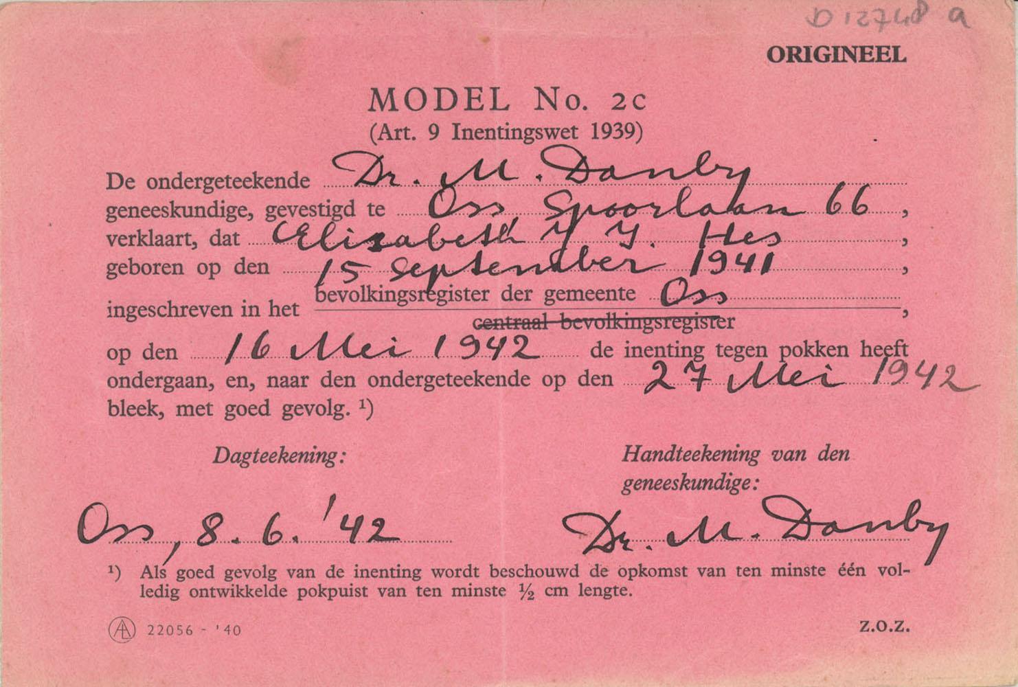Bevat: a: inentingsbewijs van dr. Danby, op naam van Elisabeth J.J. Hes, voor inenting tegen pokken, juni 1942 b: verklaring van Gemeentepolitie Oss, op naam van Elisabeth Hes, van vermissing 2e distr.stamkaart , met mededeling dat zij in maart 1943 onderdook., oktober 1944 c: tweede distributiestamkaart op naam van Elisabeth J.J. Hes d: felicitatiebrief van kennissen in De Rips (Noord-Brabant) aan ouders Elisabeth Hes, i.v.m. geboorte van een jongen, december 1949 e: twee certificaatjes van de Nationale Monumenten Commissie voor oorlogsgedenktekens, m.b.t. oprichting monument op de Dam in Amsterdam
