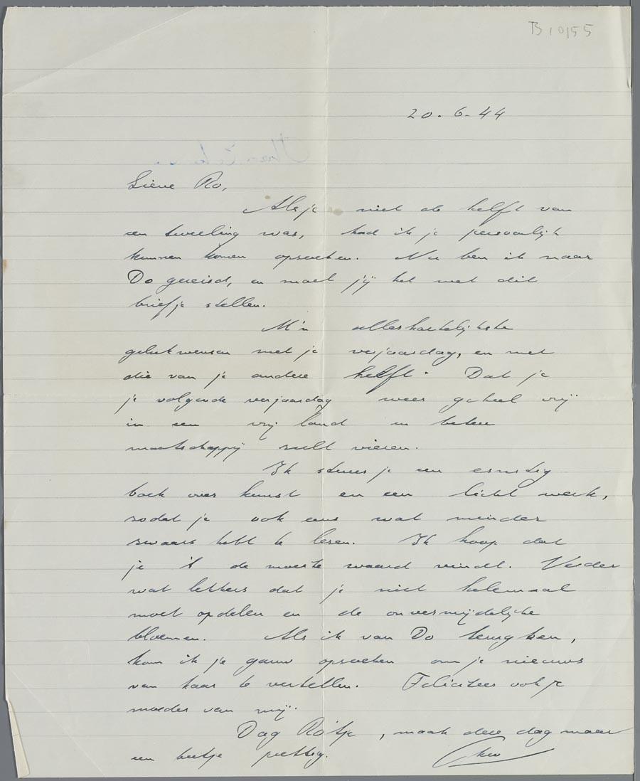 Brief van Theo Eskens aan Ro Mogendorff (1907-1969) om haar te feliciteren met haar verjaardag, 1944