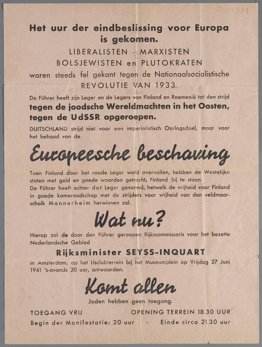 Pamflet voor een pro-Duitse bijeenkomst op het Museumplein, 27 juni 1941, in Amsterdam met Seyss-Inquart en de tekst "Joden hebben geen toegang", 27 juni 1941.
