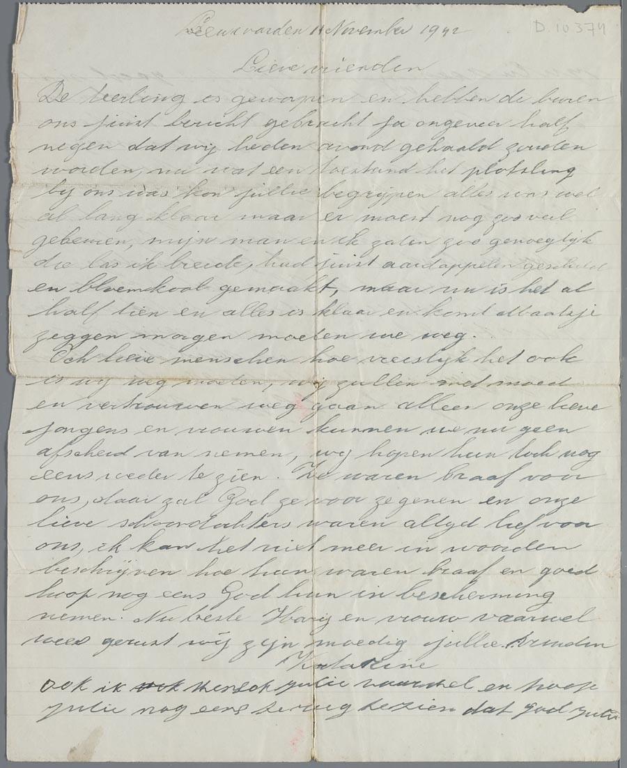 Afscheidsbrief van een vrouw uit Leeuwarden, geschreven de avond voor ze werd opgehaald, d.d. 11 november 1942.