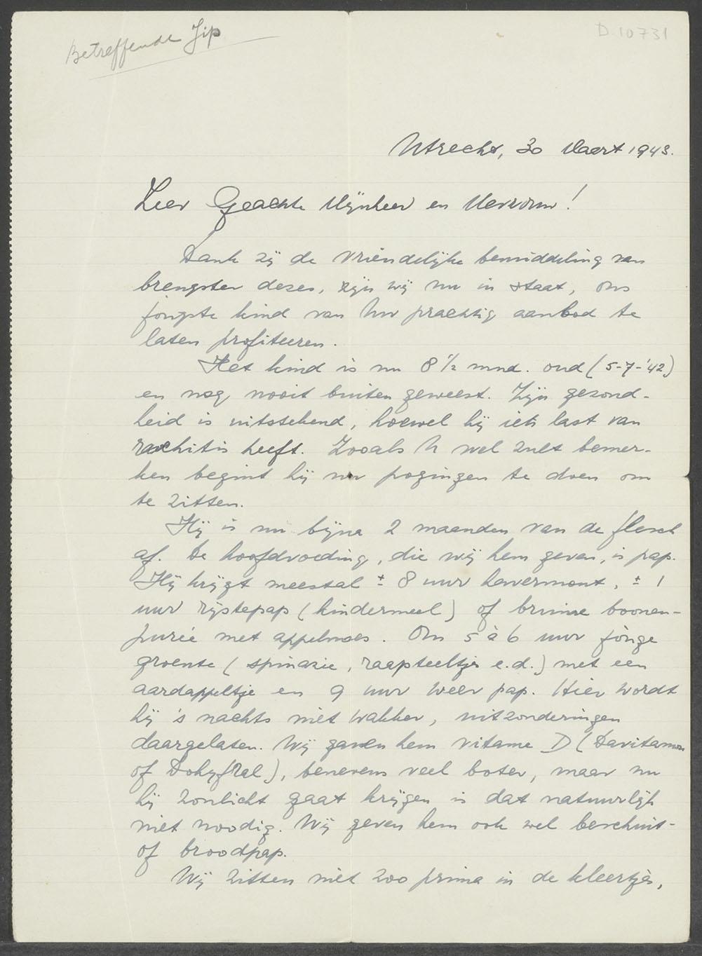 Brief van A. Wijnberg en echtgenote aan de heer en mevrouw Visser in Driebergen over hun 8 1/2 maand oude ondergedoken zoontje Jip, 1943