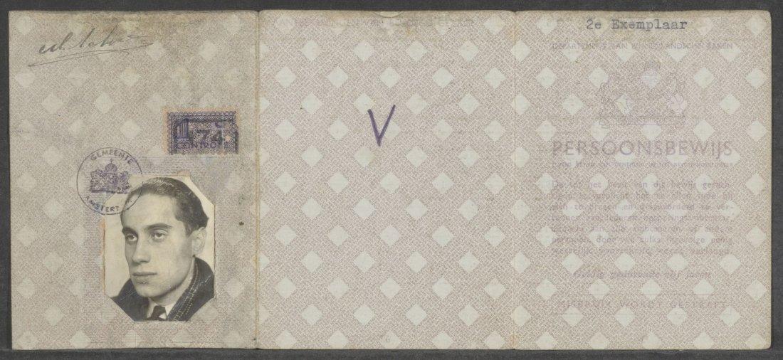 Persoonsbewijs met een J van Wolf Tokkie (1922-2001) en een vervalst persoonbewijs van dezelfde op naam van Meindert Schouten, 1941-1942