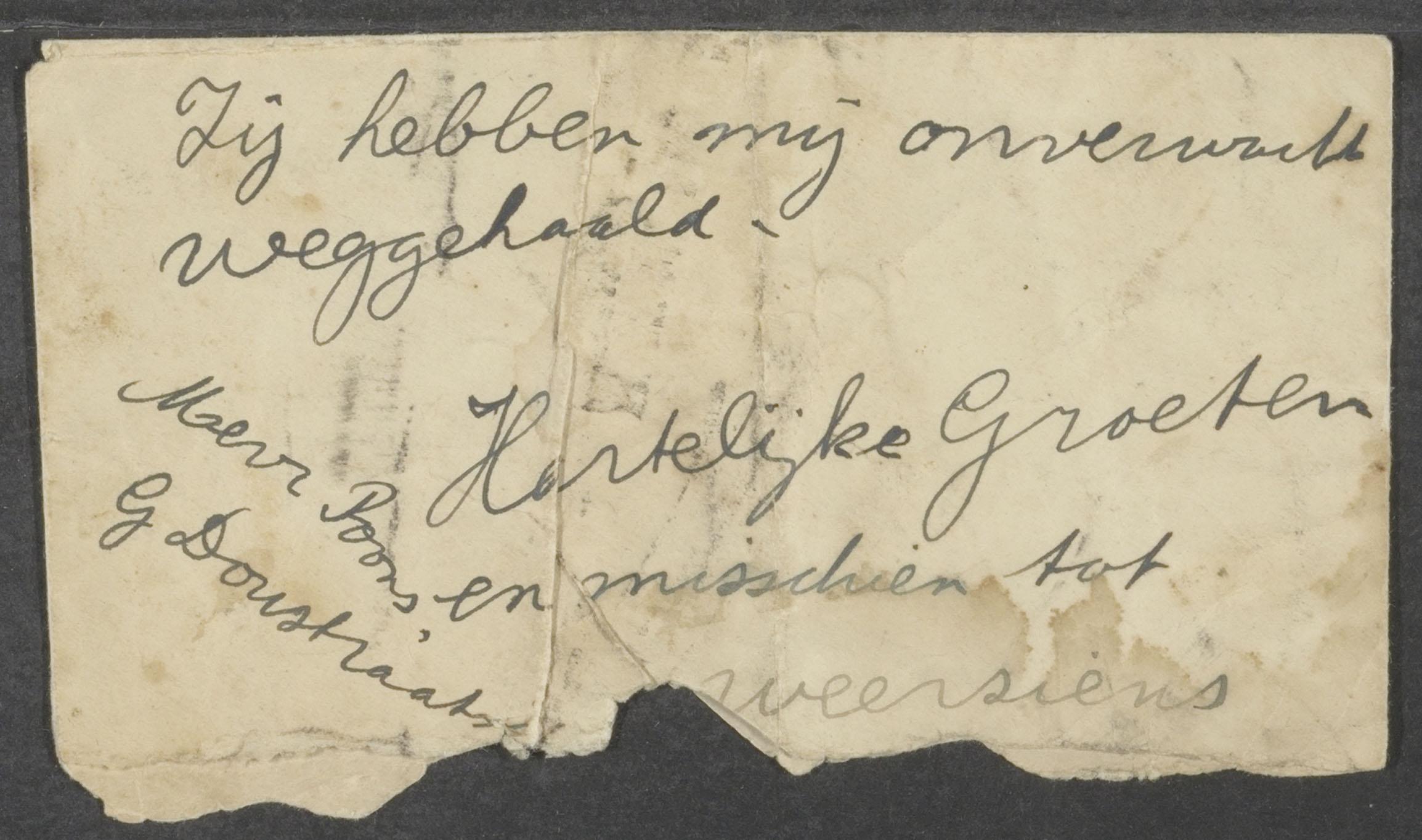 Afscheidsbriefje van mevrouw Poons uit de Gerard Doustraat in Den Haag aan haar buurvrouw mevr. Van der Linden-Beuker, circa 1942